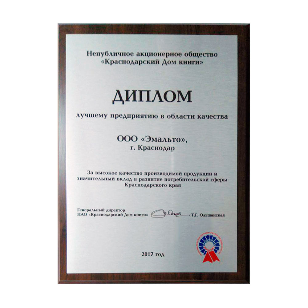 ООО "Эмальто" награждено дипломом «Лучшее предприятие в области качества»